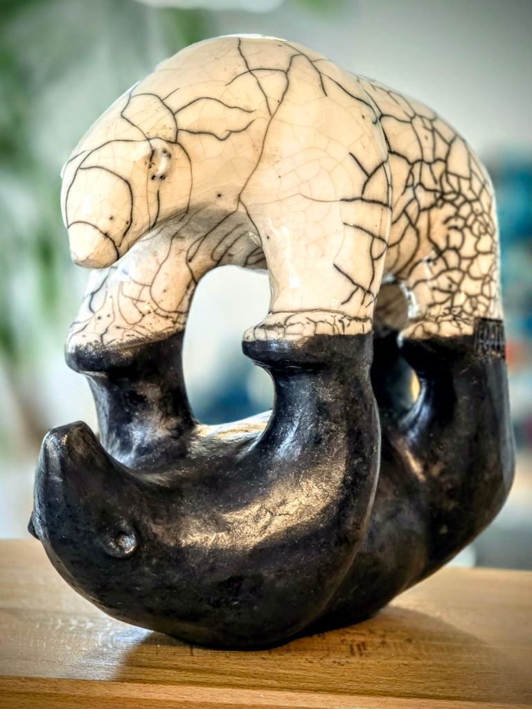 Dans la série des ours, moins dansants, plus se reflétant, voici une sculpture réalisée en terre chamottée, cuite en raku et légèrement patinée. Il s’agissait cette fois d’allier symétrie et contraste, ouverture et introspection, clair-obscur. Le voici en quelques étapes : Voir l’article