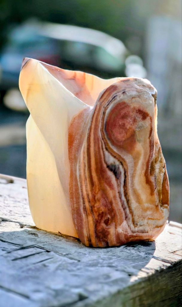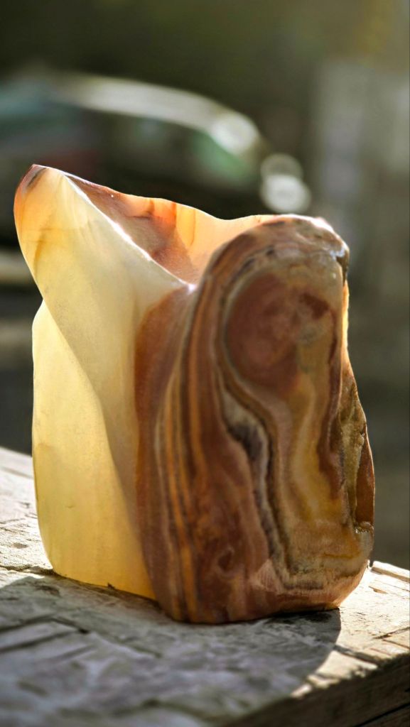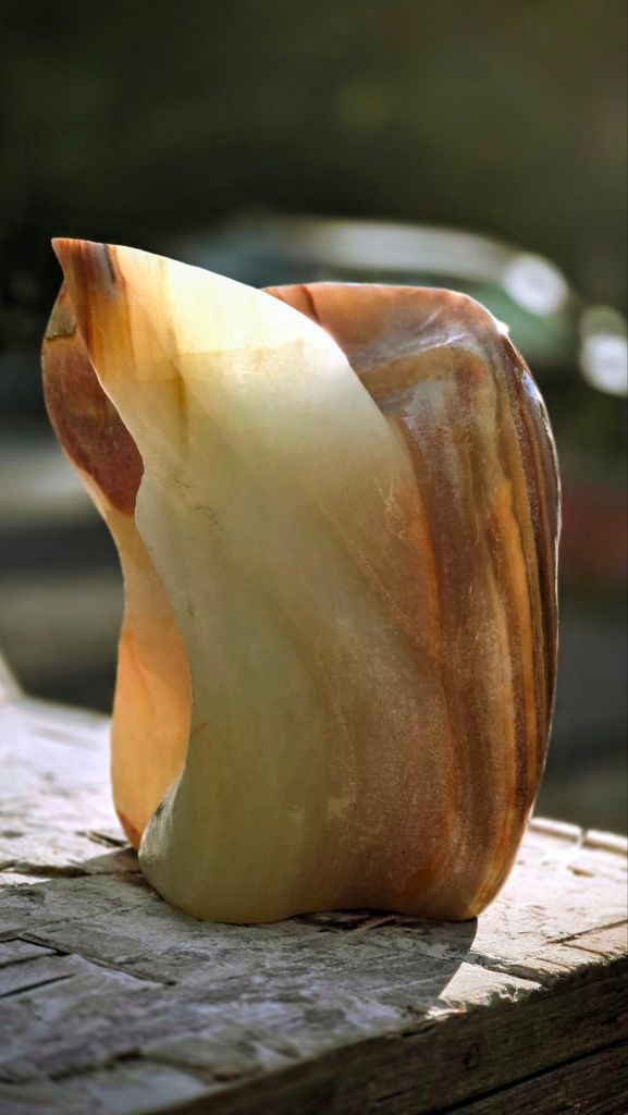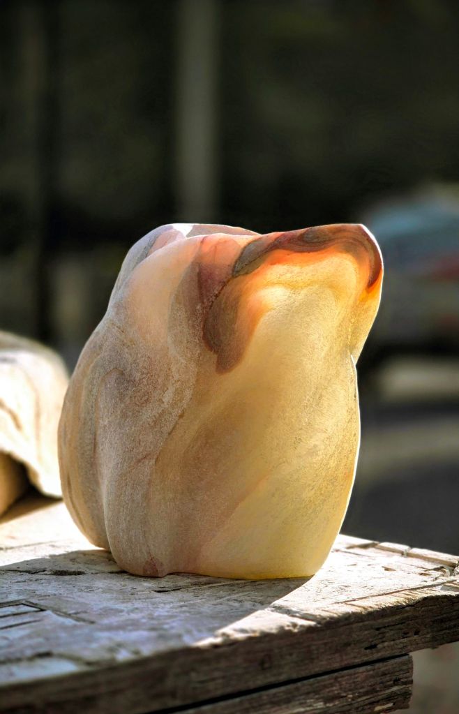 En ce moment, je travaille l’onyx, une pierre de la famille des marbres, riche en couleurs et en possibilités. Celles-ci font varier les couleurs les plus chaudes et sont plus ou moins pures, ce qui les rend très difficiles à travailler puisqu’il faut s’adapter à différentes densités. Pour respecter leurs veines et leur mouvement, je choisis la taille directe. Ainsi, c’est à moi de m’adapter à elles : mes gestes me sont dictés par la matière et cette contrainte-là procure une liberté des plus folles !