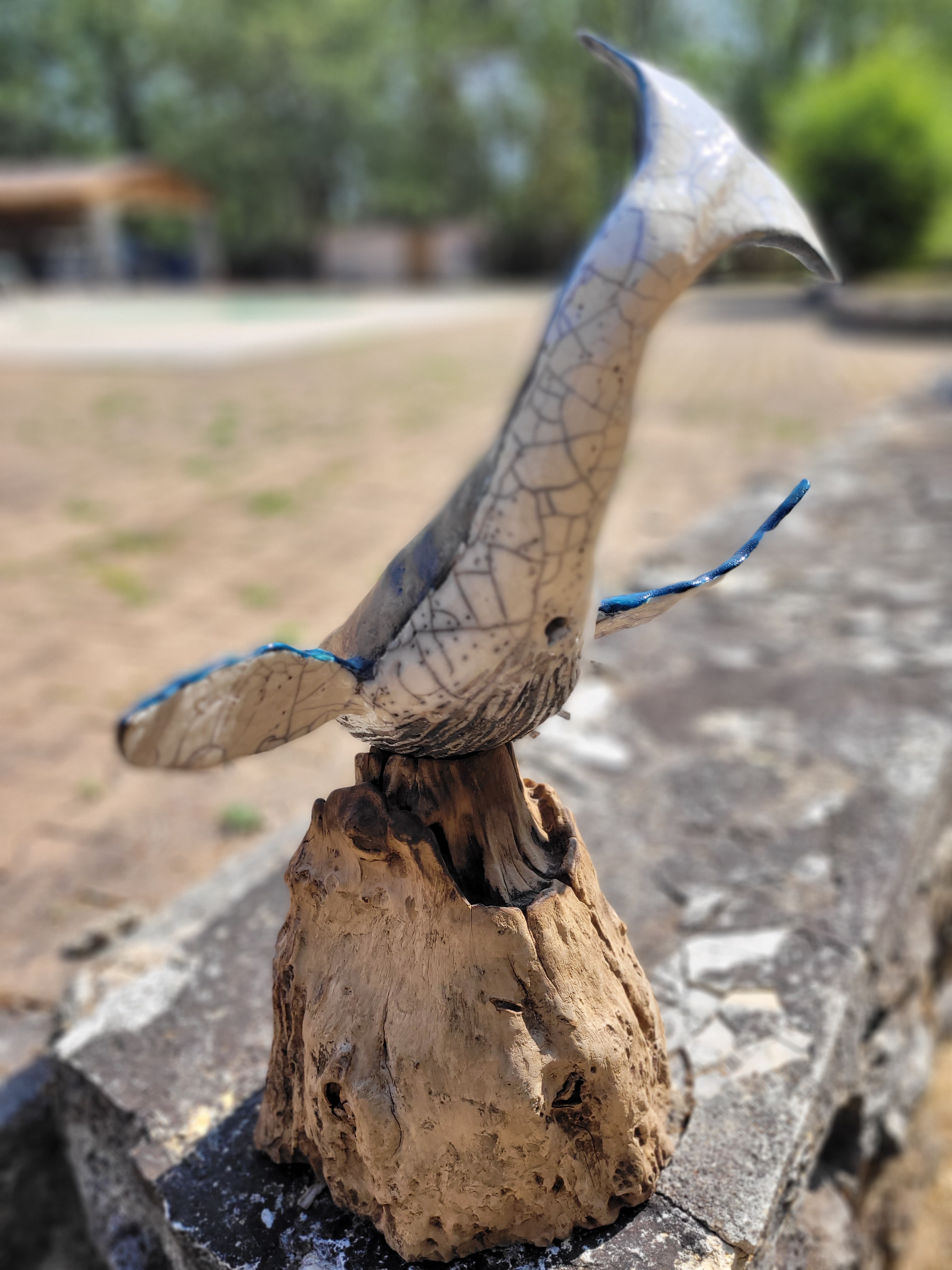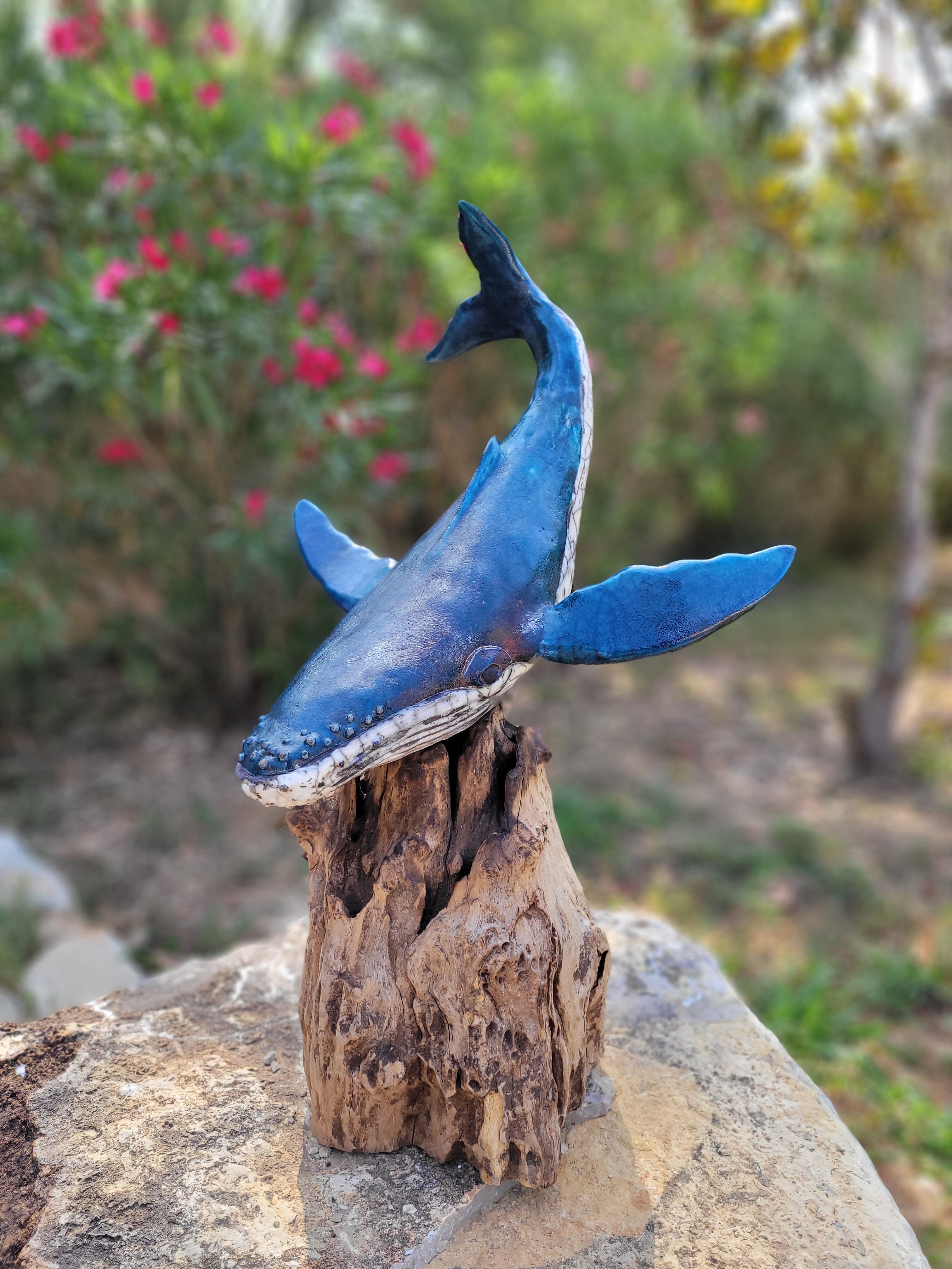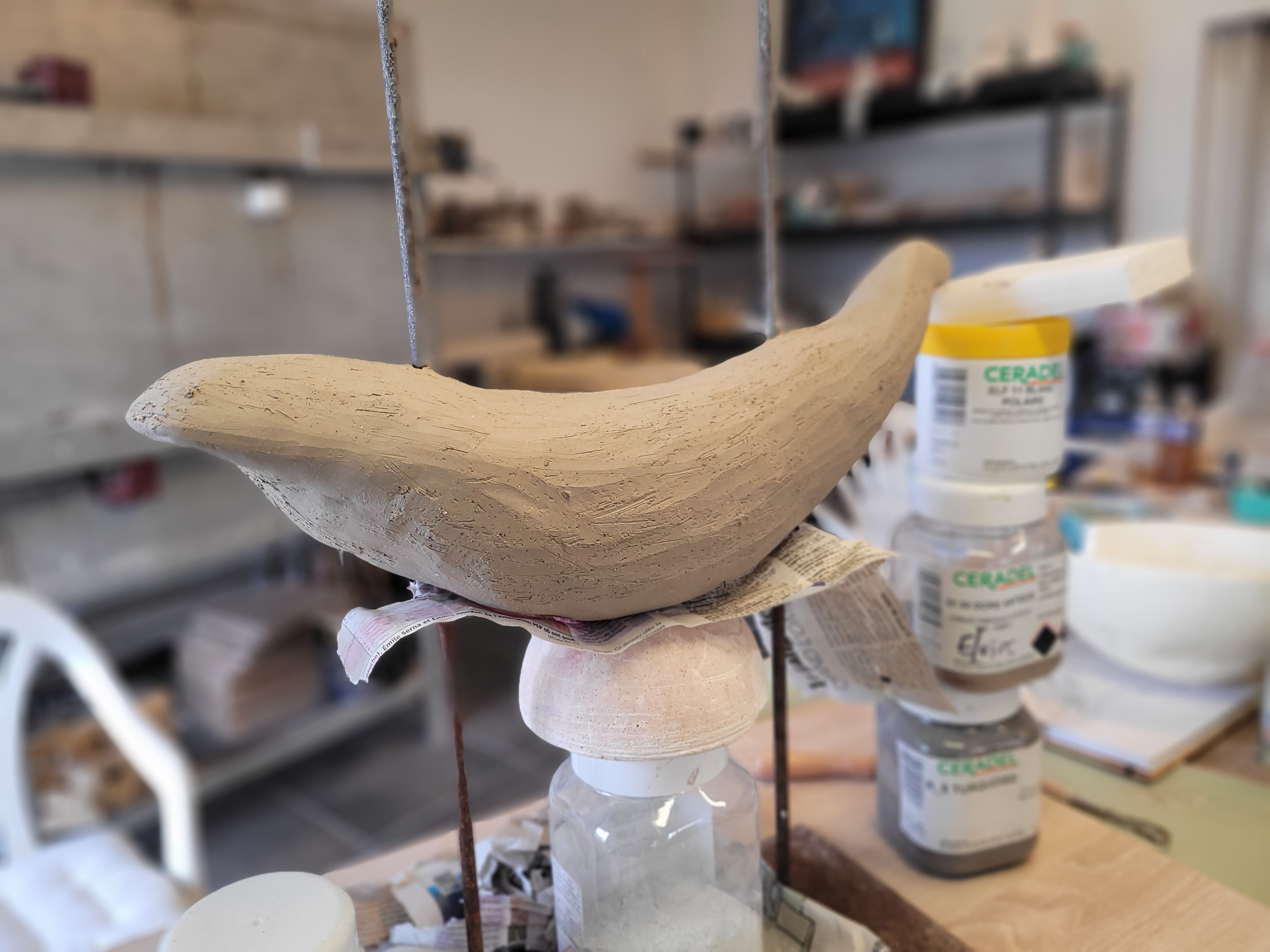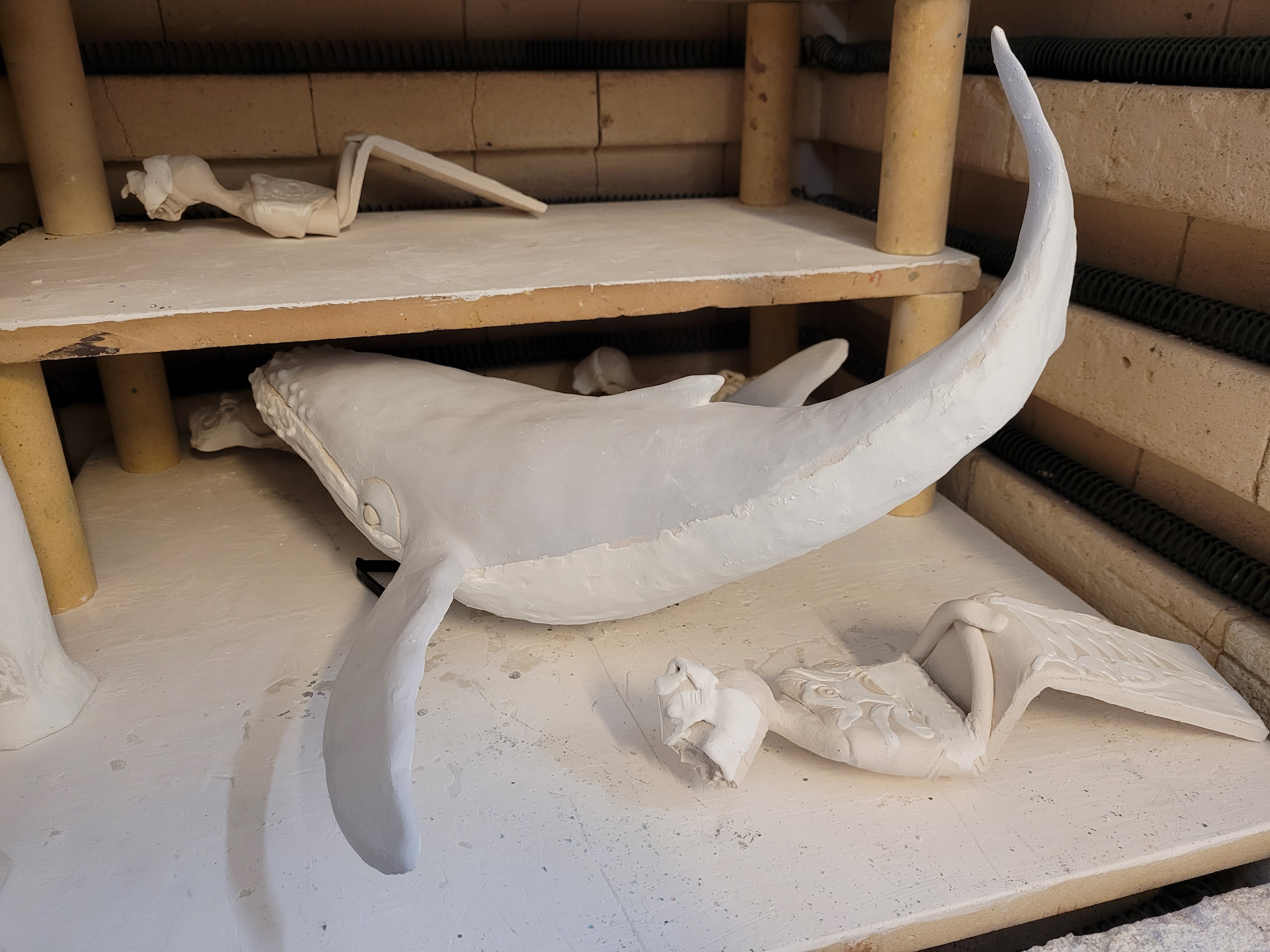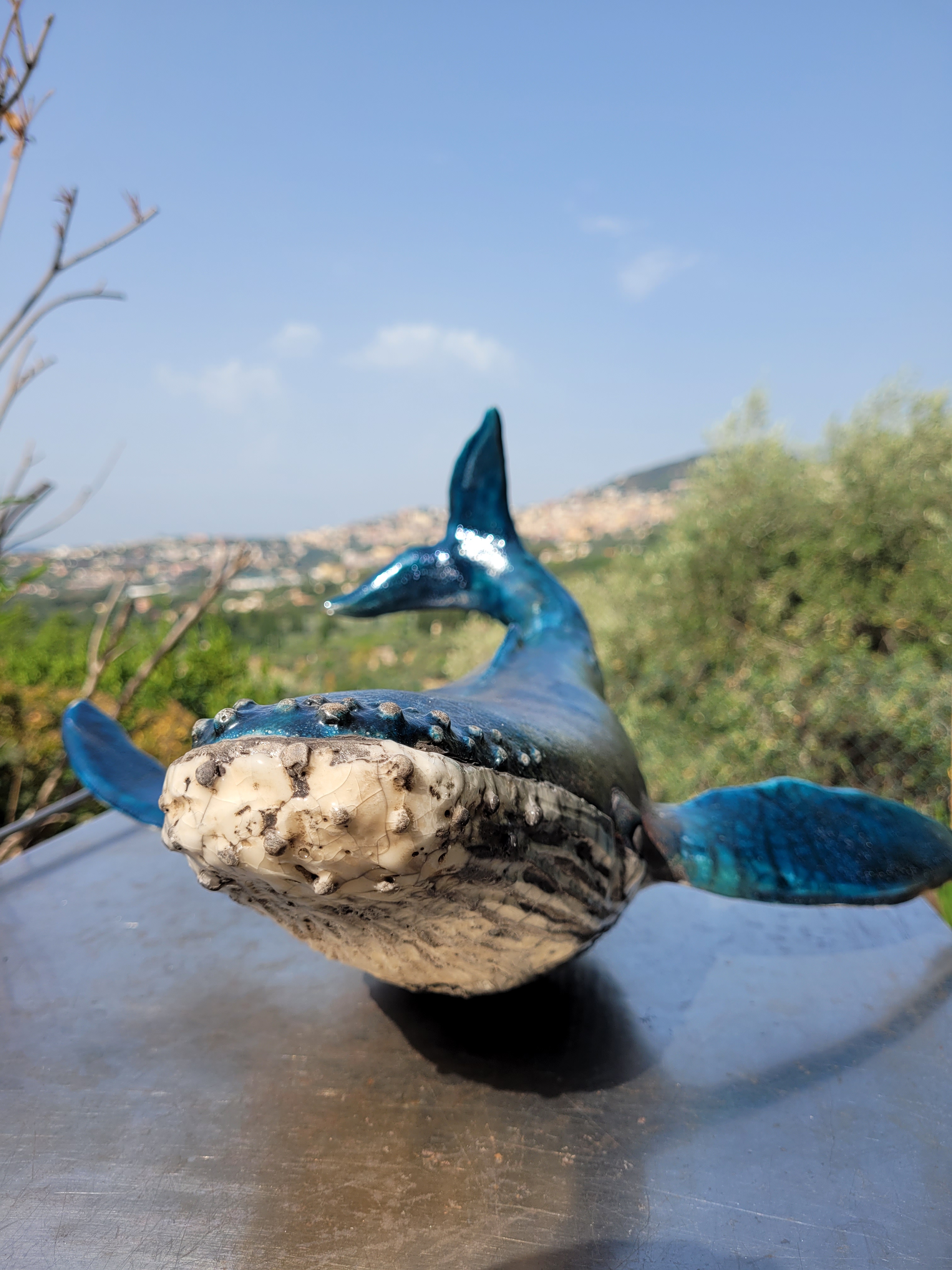 A ce jour, Hoplie est mon plus grand challenge. Réalisée pour l’amour de ma vie, qui adore les baleines à bosses, les défis étaient de : monter ce monstre, de 50cm d’envergure, sans le casser avant cuisson, de donner un mouvement « aérien » à un mastodonte aquatique, de trouver un émaillage qui lui fasse honneur, et de trouver un moyen d’exposer la chose de manière stable, et si possible, esthétique.