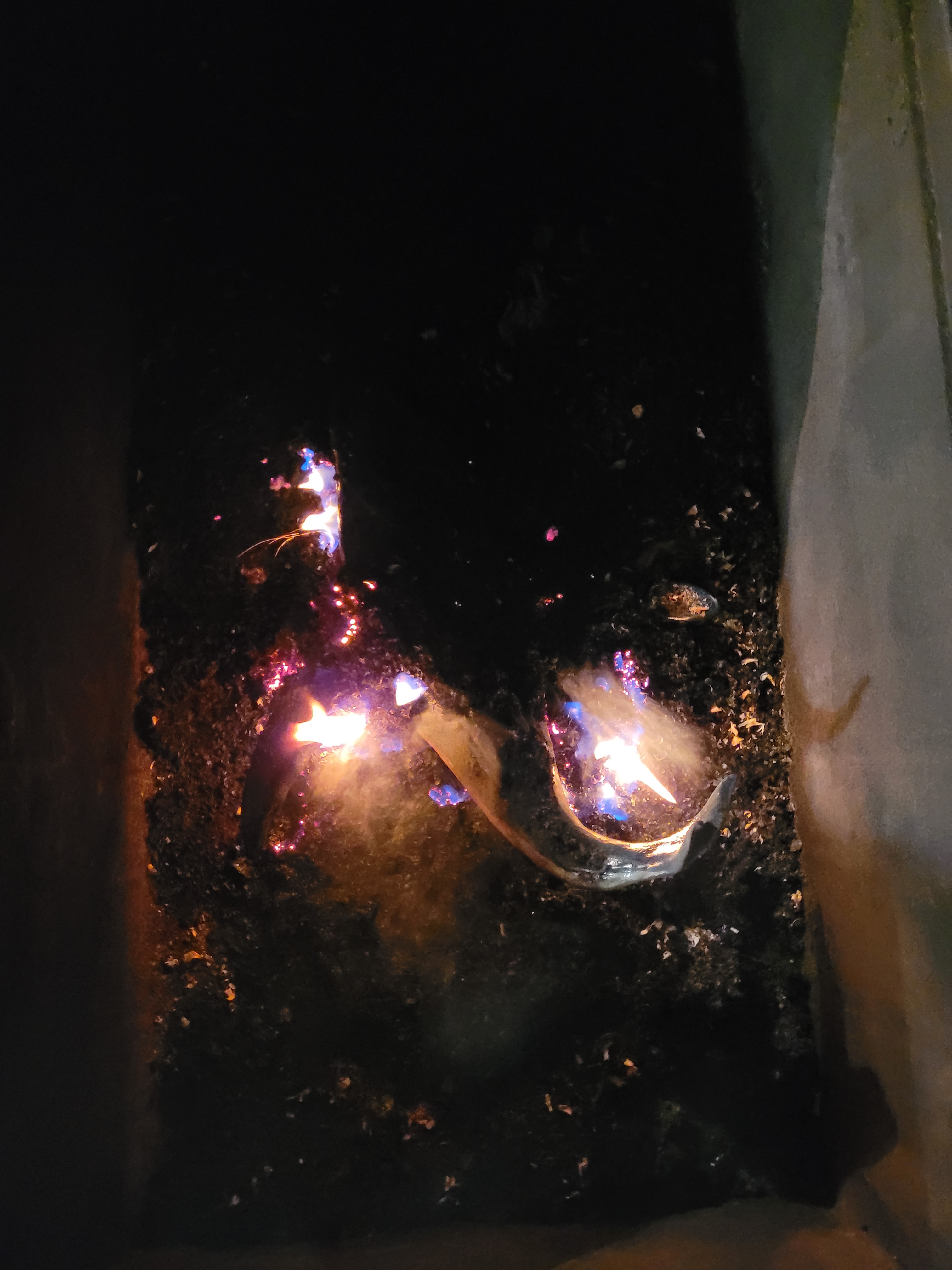 Le résultat est, comme souvent dans le raku, du pur bonheur dans le hasard ! Dans les flammes, les oxydes ont révélé un irisé polychrome, allant du rouge cuivré au nacre bleu/vert, en passant par un bleu des profondeurs océaniques et par un effet d’écailles métalliques, pour le plus grand bonheur de sa créatrice !