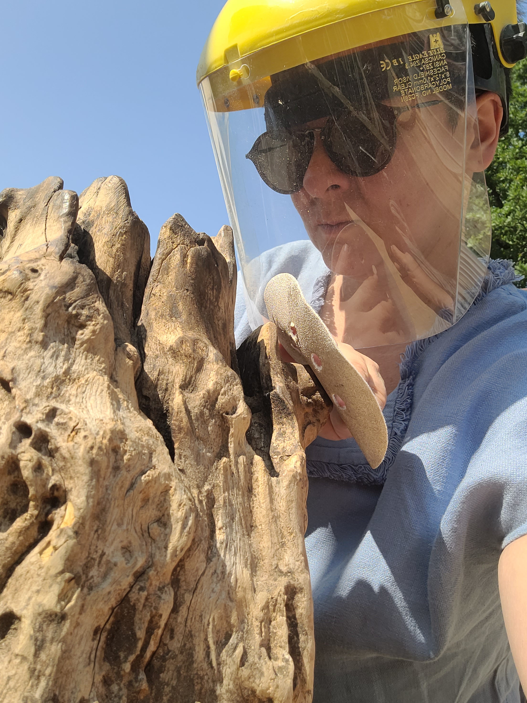 Pour cette dernière étape, je me suis rappelé avoir un vieux morceau de bois qui pourrait rendre service… J’ai eu besoin, pour réaliser sa mise en support, de l’aide précieuse d’Éric Belkovsky, de WoodExpression, qui m’a accueillie dans son atelier et qui a retravaillé ce vieux morceau de teck pour qu’Hoplie trouve son équilibre !