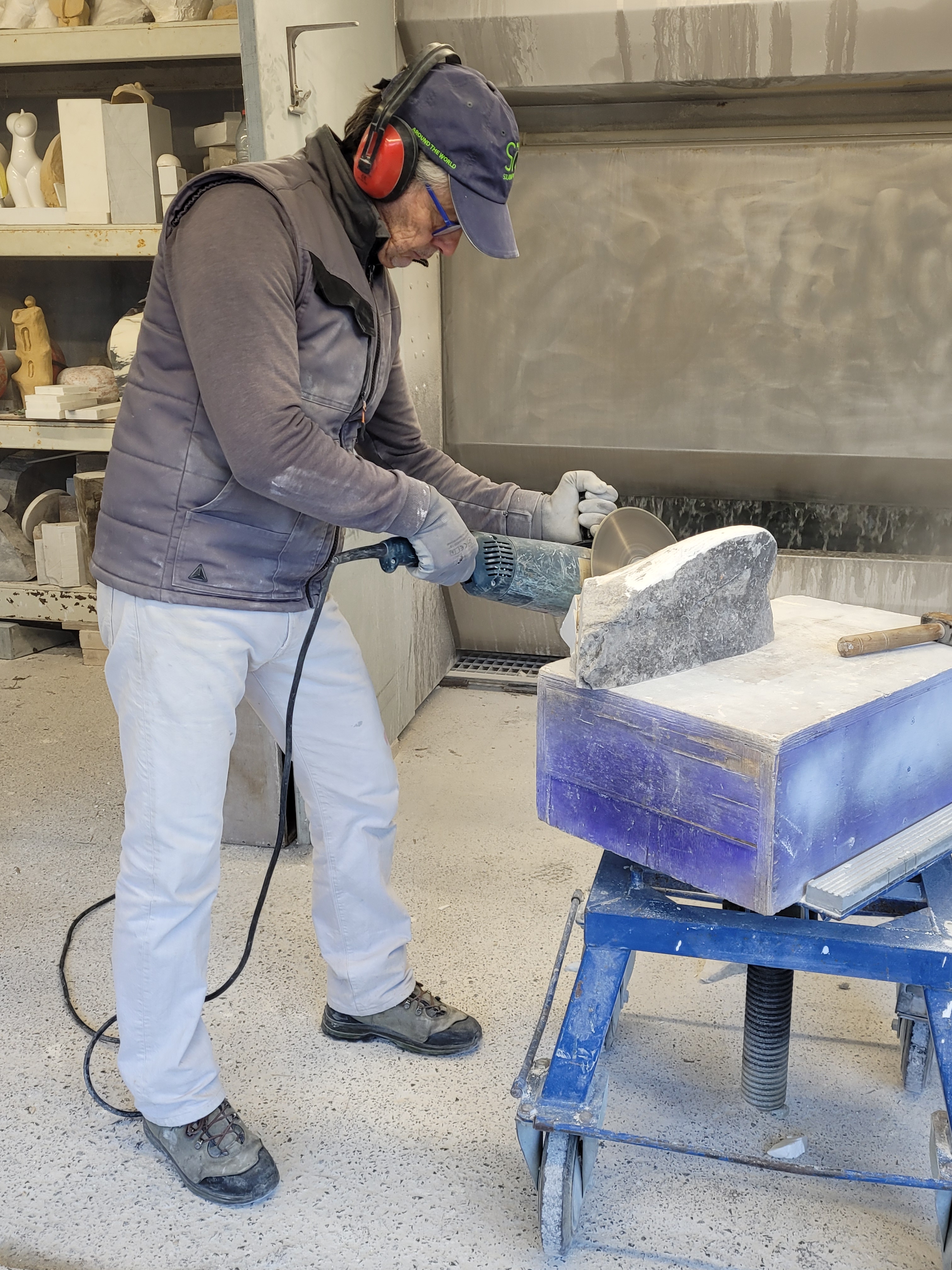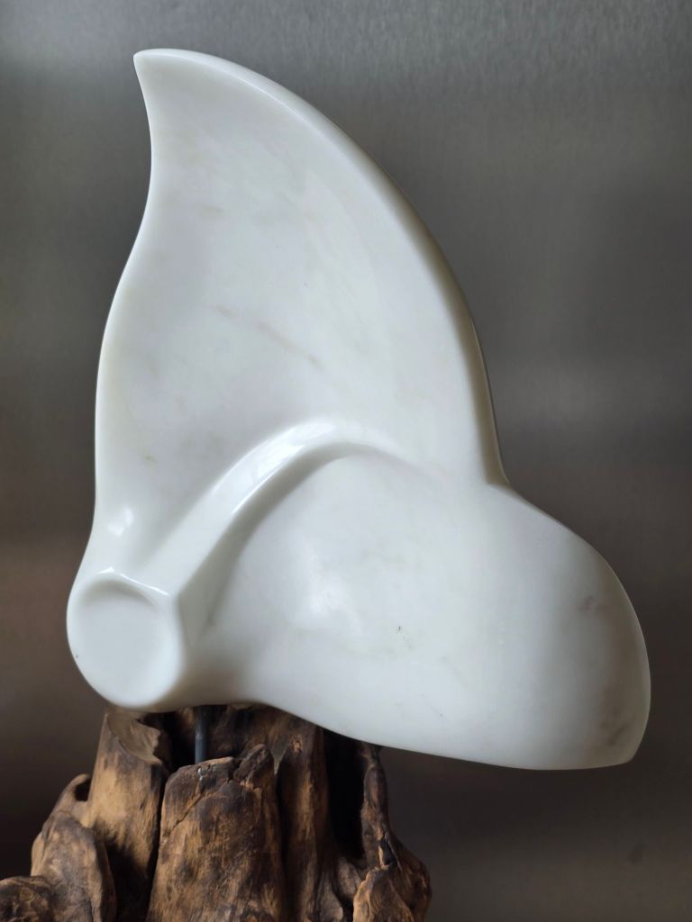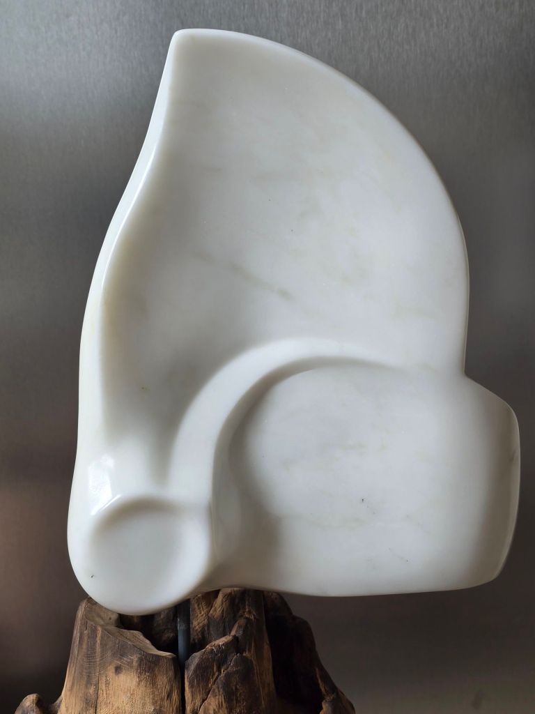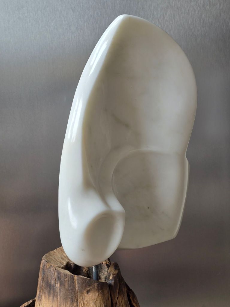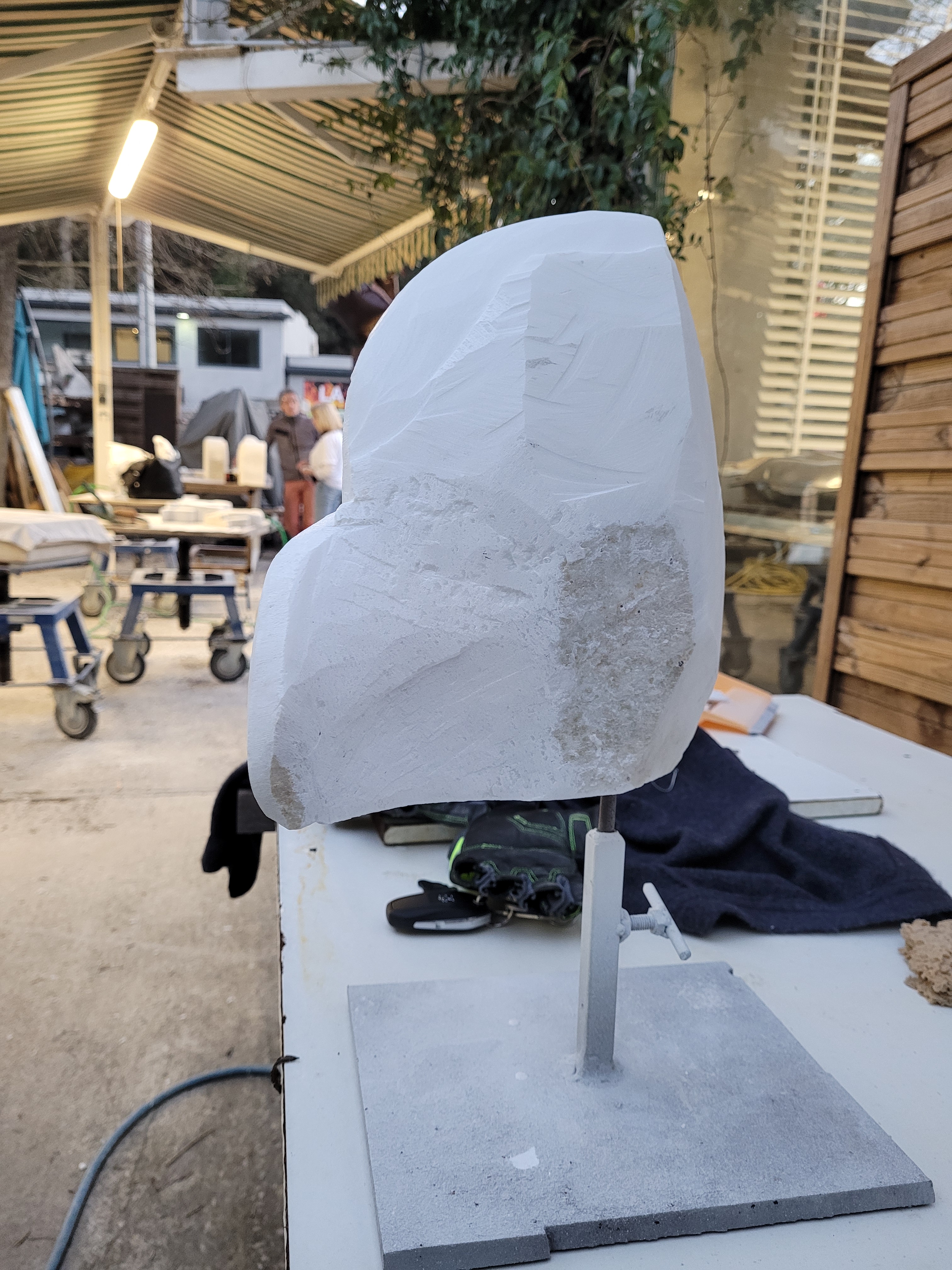 Ici, j’ai procédé en taille directe : sans modèle, sans mesure. J’ai vu la forme apparaître dans le bloc et je l’ai travaillé jusqu’à la faire naître. C’était long, mais j’en ai savouré chaque étape.