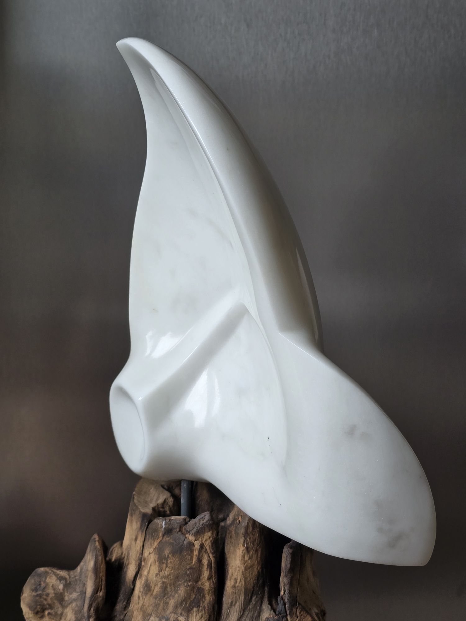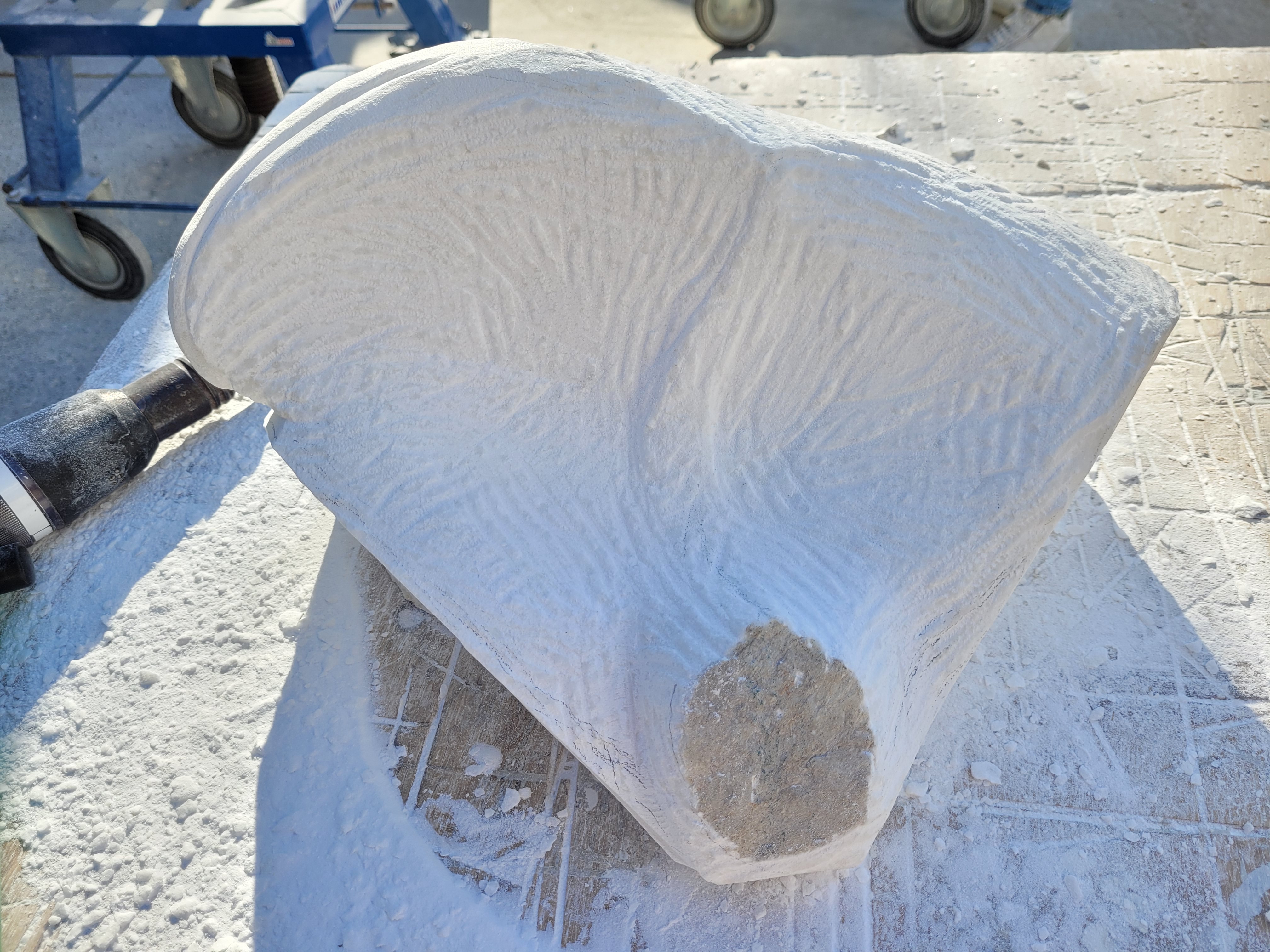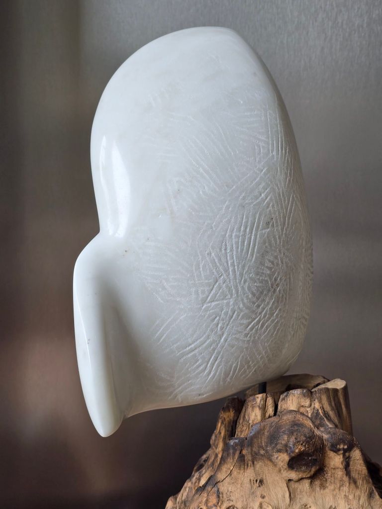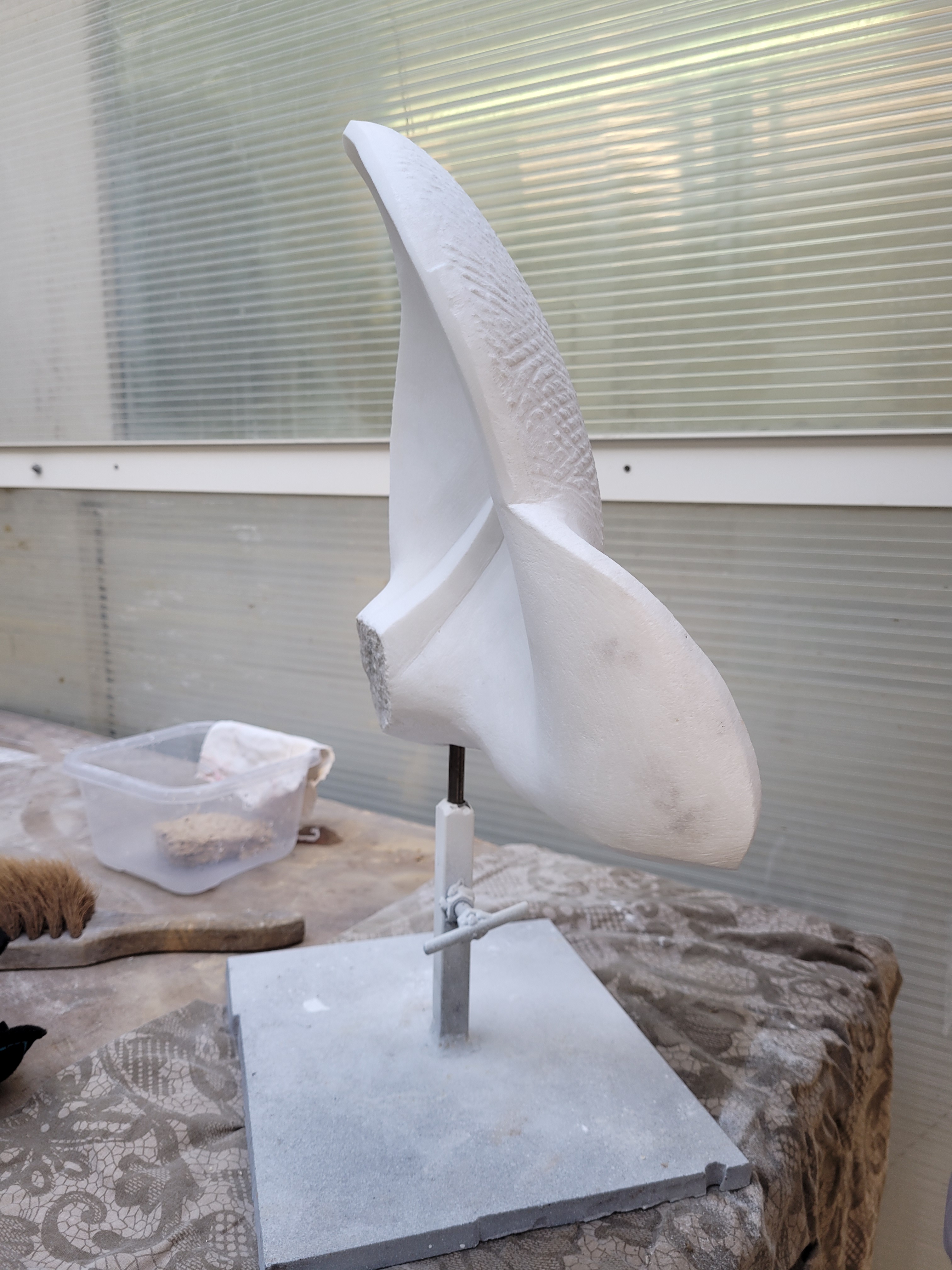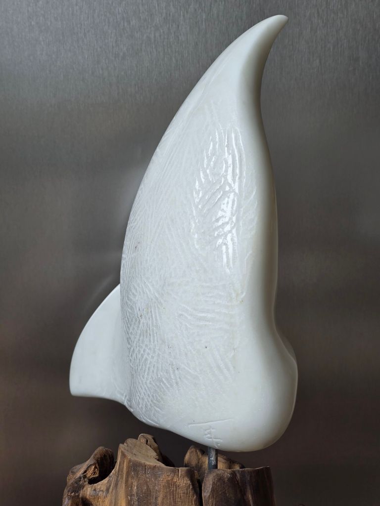 Ici, j’ai procédé en taille directe : sans modèle, sans mesure. J’ai vu la forme apparaître dans le bloc et je l’ai travaillé jusqu’à la faire naître. C’était long, mais j’en ai savouré chaque étape.