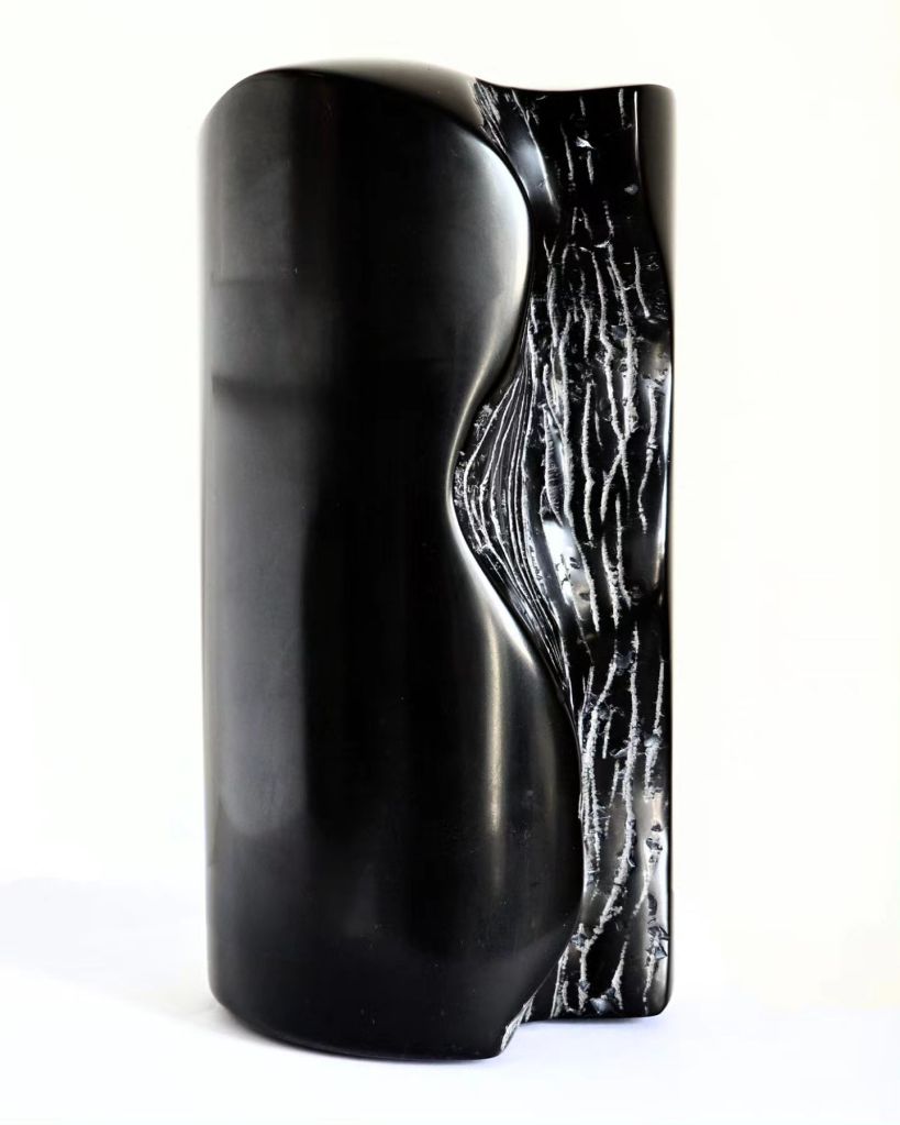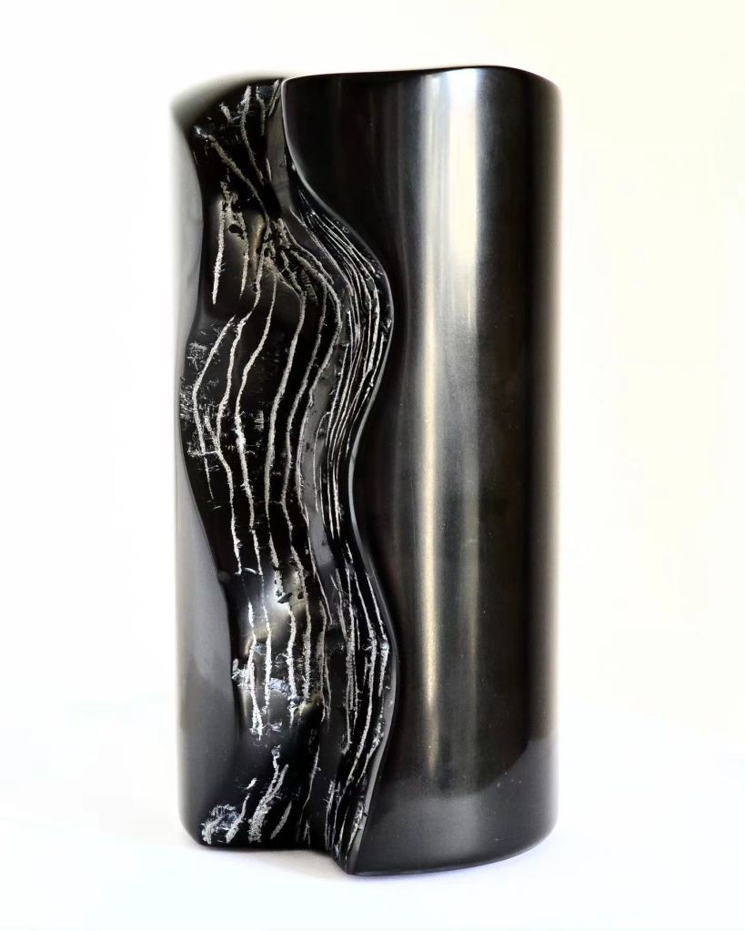 Mais il s’opère une sorte de petit miracle : un petit bout de pierre carottée d’un gris incertain devient une sculpture à la géologie fluctuante, d’un noir scintillant dans lequel on se reflète.