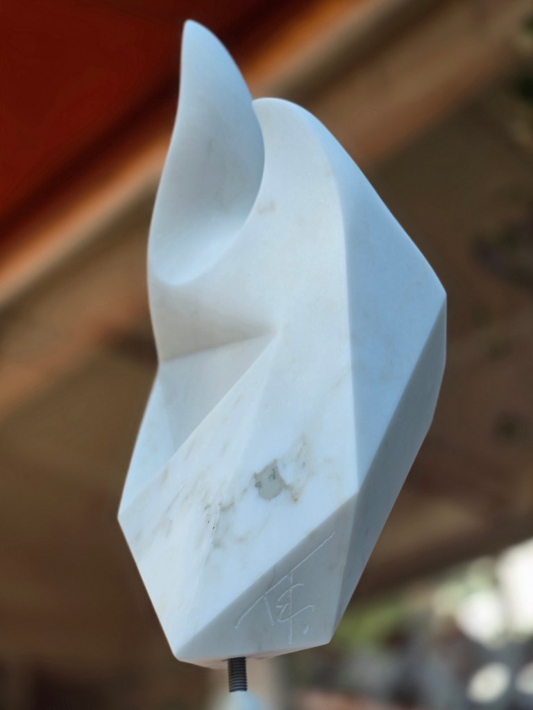 Pour ce troisième marbre, je me suis aventurée en taille directe dans un exercice compliqué, histoire d’éprouver un peu ma technique. Il s’agissait de créer arêtes et courbes, (presque) sans disqueuse. A part les 3 plats initiaux, toutes les arêtes qui apparaissent dans la partie inférieure de l’iceberg sont créées au ciseau plat. C’était une entreprise audacieuse… et hasardeuse !