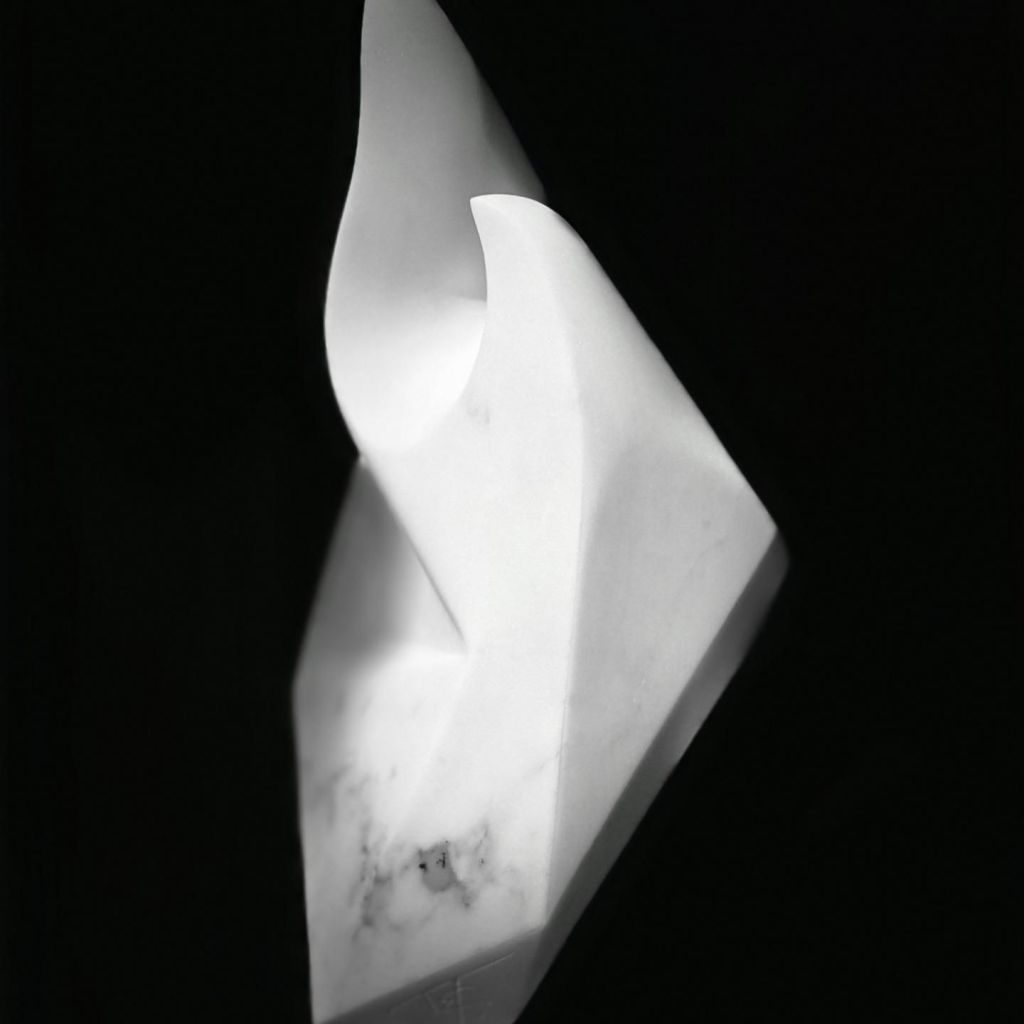 Cette sculpture, en marbre blanc de Carrare, représente – à ma manière – le travail du sculpteur. Ce qui donne le caractère d’une pièce, c’est ce travail d’arêtes et de courbes, ces jeux de clair-obscur, cette recherche de l’ombre et de la lumière… et ce travail qui prend du temps, qui débute au printemps et s’achève à l’automne. Au Canada, le printemps est la saison des Icebergs… l’automne, celui des arbres en feu.