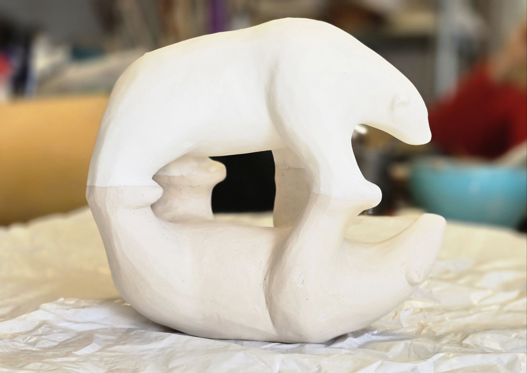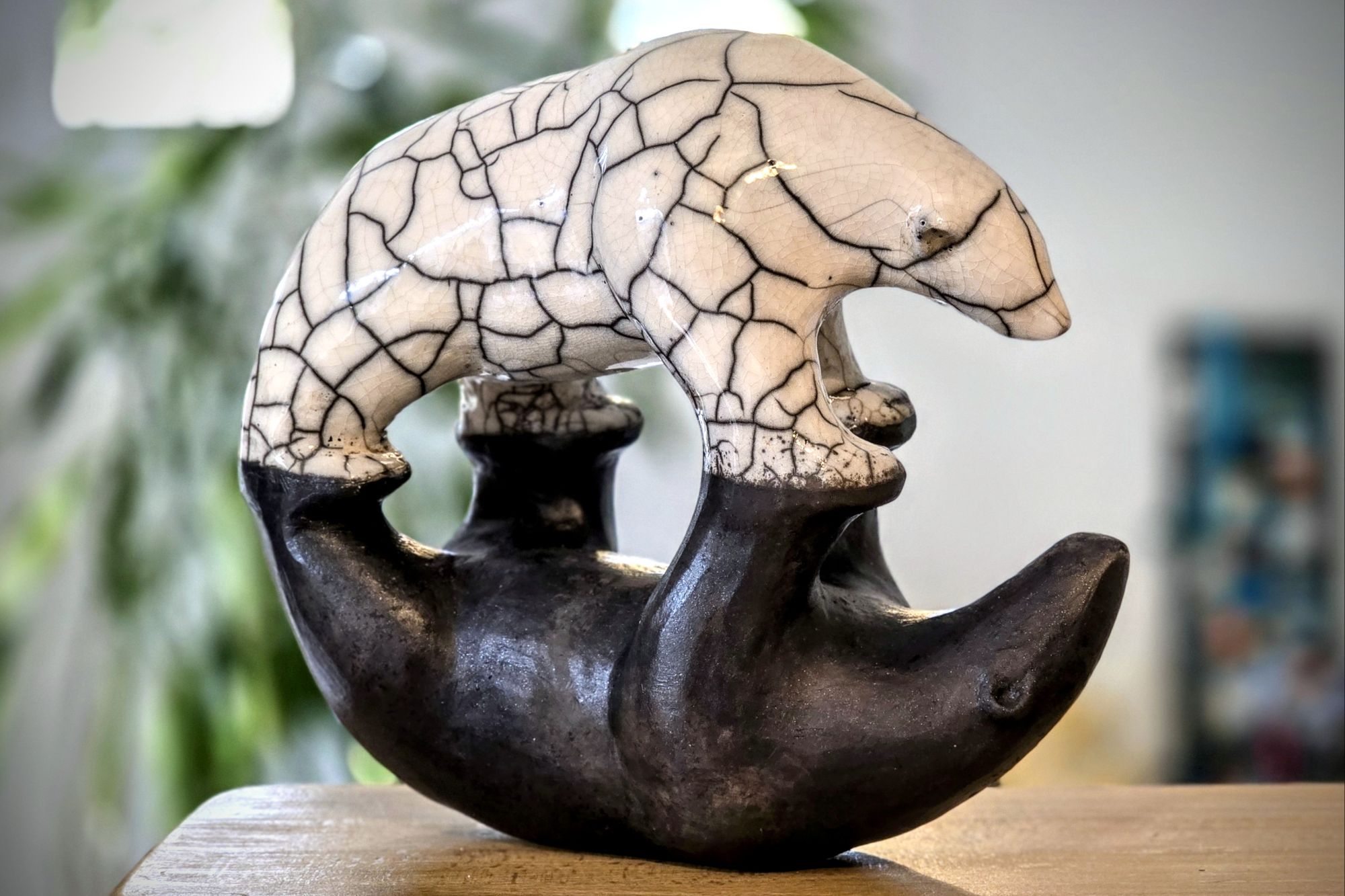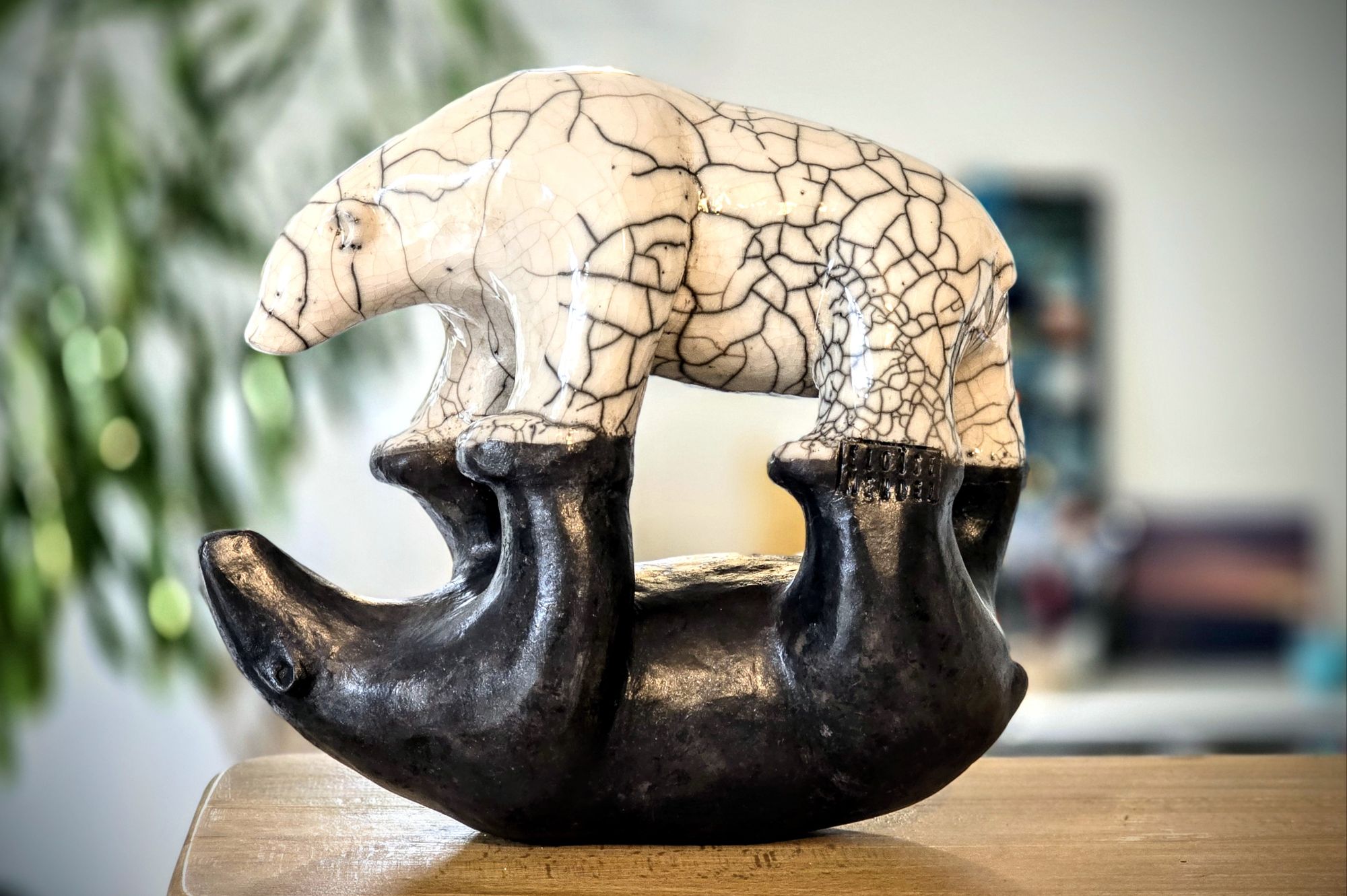 Dans la série des ours, moins dansants, plus se reflétant, voici une sculpture réalisée en terre chamottée, cuite en raku et légèrement patinée. Il s’agissait cette fois d’allier symétrie et contraste, ouverture et introspection, clair-obscur.