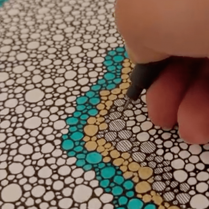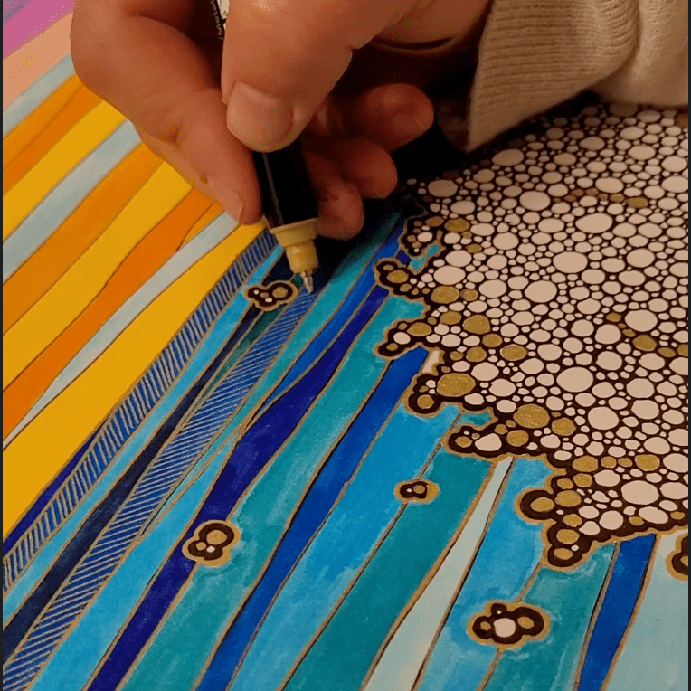 Toute forme d’art est une thérapie, selon mon expérience. Mais il existe certaines pratiques sans doute un peu moins artistiques que thérapeutiques. C’est un peu le cas de ces vidéos qui circulent sur les réseaux, des instagrameuses comme lilith.black.bee ou robertaboffoart, que j’aime beaucoup regarder faire. Quand je me suis retrouvée immobilisée, j’ai voulu essayer, et voilà ce que ça a donné.
